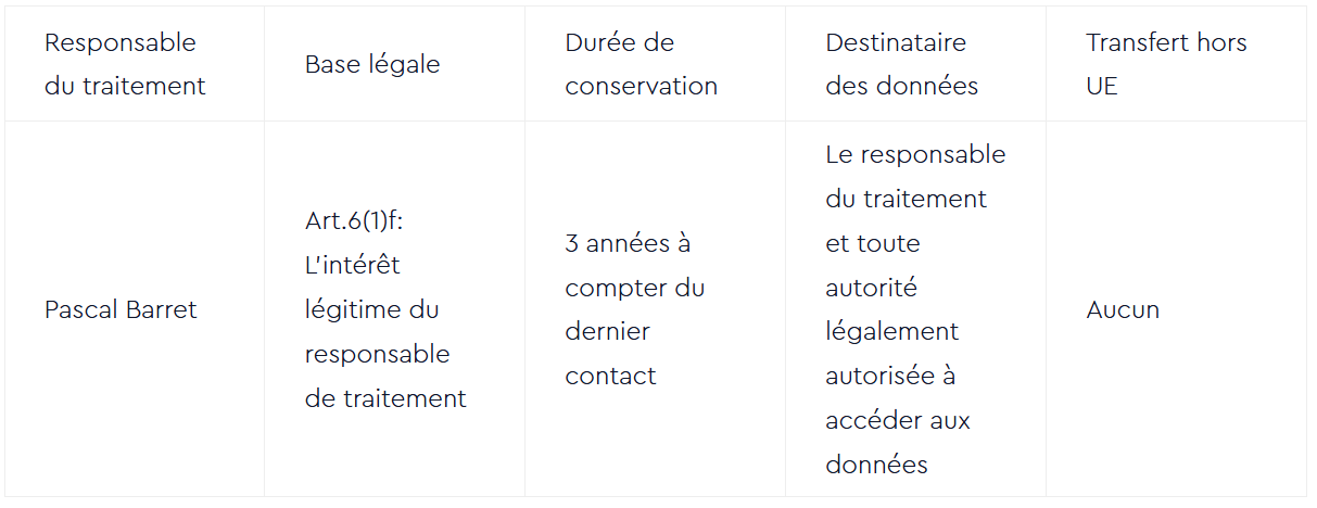 | Pascal Barret | Art.6(1)f: L’intérêt légitime du responsable de traitement | 3 années à compter du dernier contact | Le responsable du traitement et toute autorité légalement autorisée à accéder aux données | Aucun |
