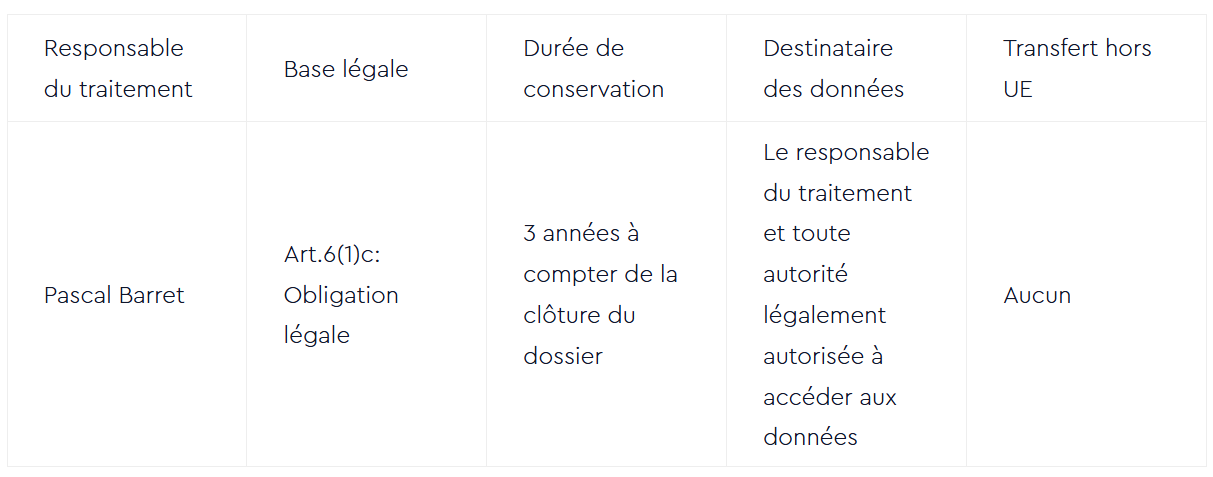 | Pascal Barret | Art.6(1)c: Obligation légale | 3 années à compter de la clôture du dossier | Le responsable du traitement et toute autorité légalement autorisée à accéder aux données | Aucun |
