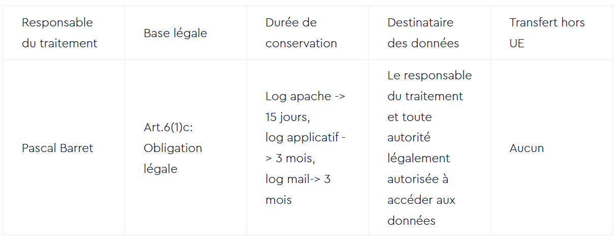 | Pascal Barret | Art.6(1)c: Obligation légale | Log apache -> 15 jours, log applicatif -> 3 mois, log mail-> 3 mois |